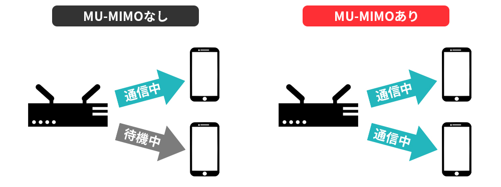 MU-MIMO対応機器は端末ごとに異なる電波を同時に送信することができ、速度が低下することなく複数の端末と同じタイミングで通信を行うことが可能です。