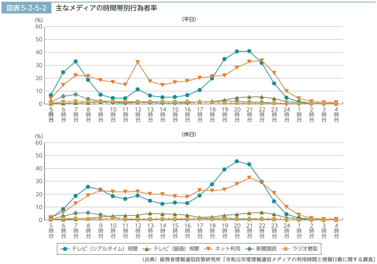 上図は総務省が「令和元年版情報通信白書」で公開した、メディアの利用時間帯を表したグラフです。