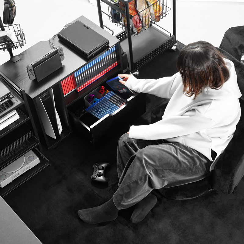 A:こたつと同じぐらいの高さのゲーム機収納ラックを近くに配置しましょう。